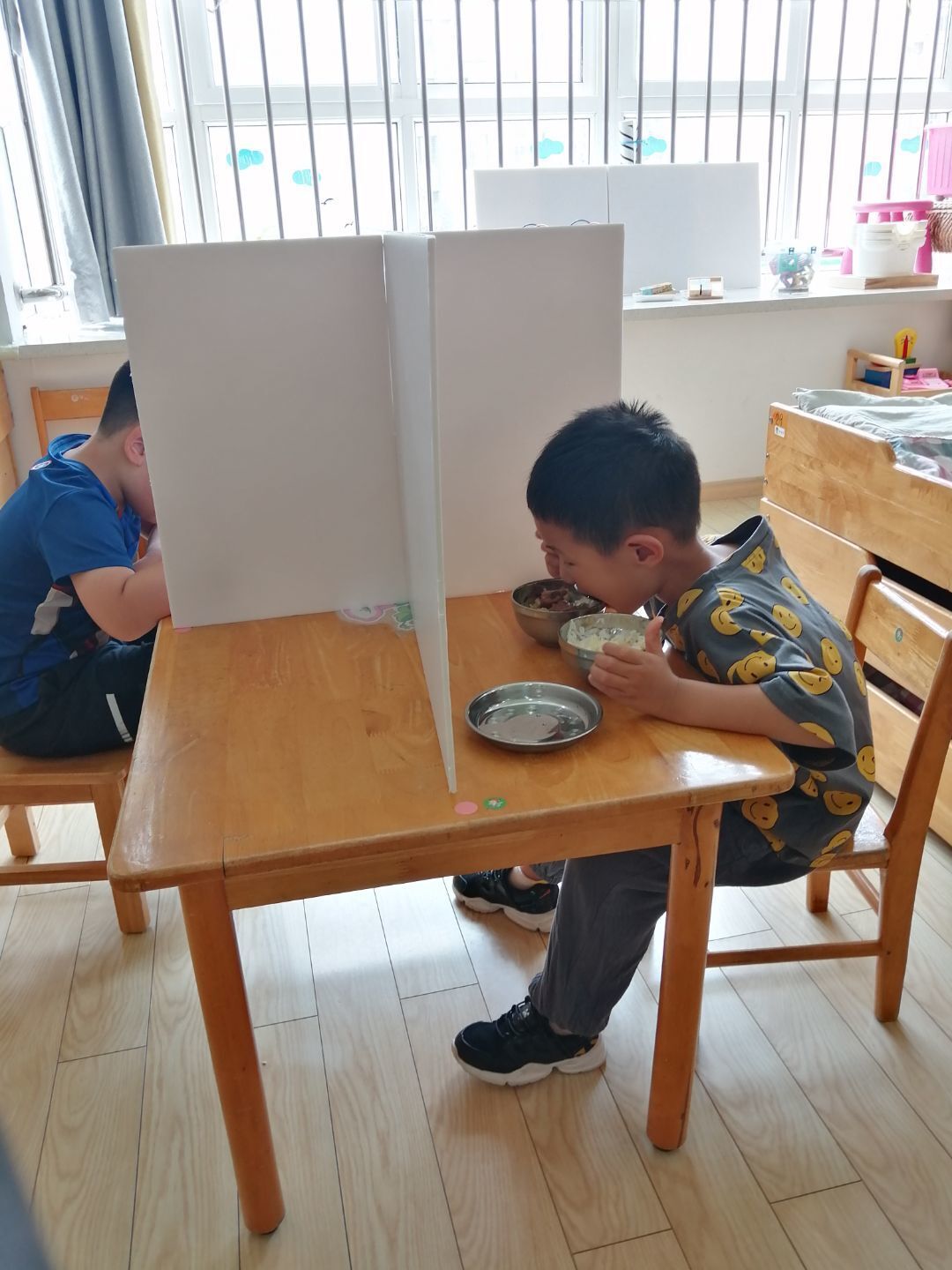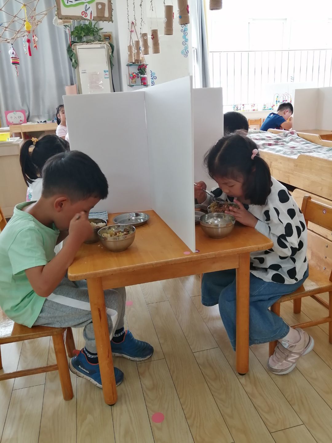 午餐时间到了,孩子们自主进餐,大口地享受香喷喷的午餐。